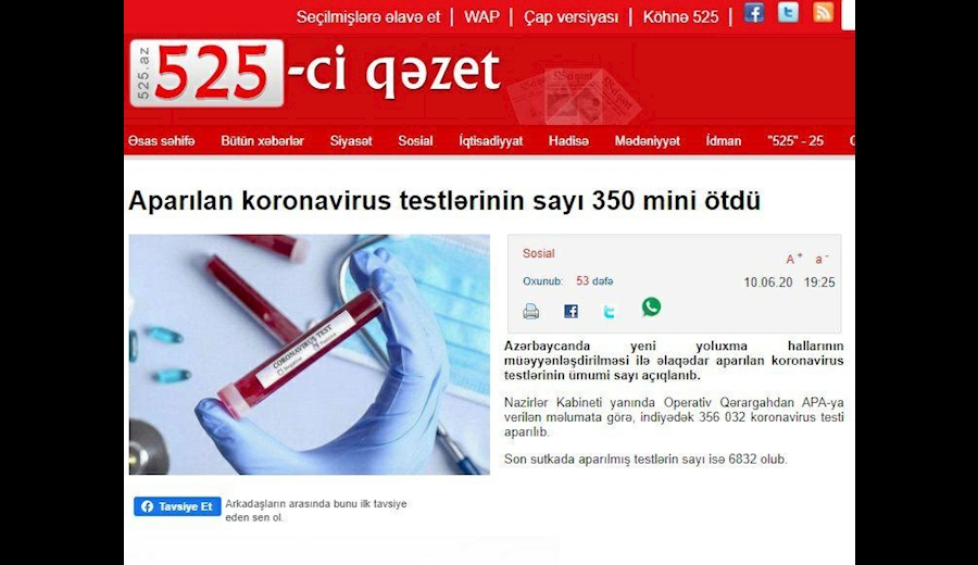 - تعداد تستهای کرونای انجام گرفته در جمهوری آذربایجان به ۳۵۶ هزار و ۳۲ مورد رسید.
