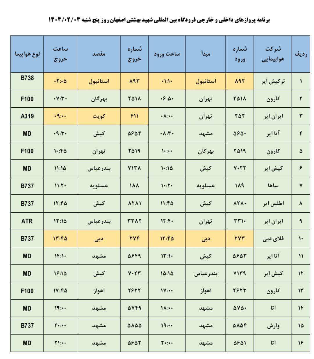 فهرست پرواز‌های فرودگاه اصفهان (چهارم اردیبهشت ۱۴۰۴)