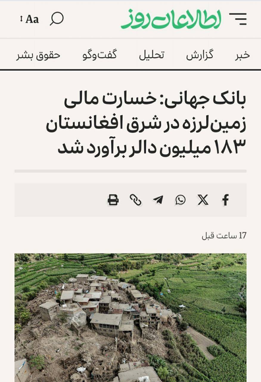 - بانک جهانی: خسارات مالی زمین لرزه در شرق افغانستان صد وهشتاد و سه میلیون دلار برآورد شده است.