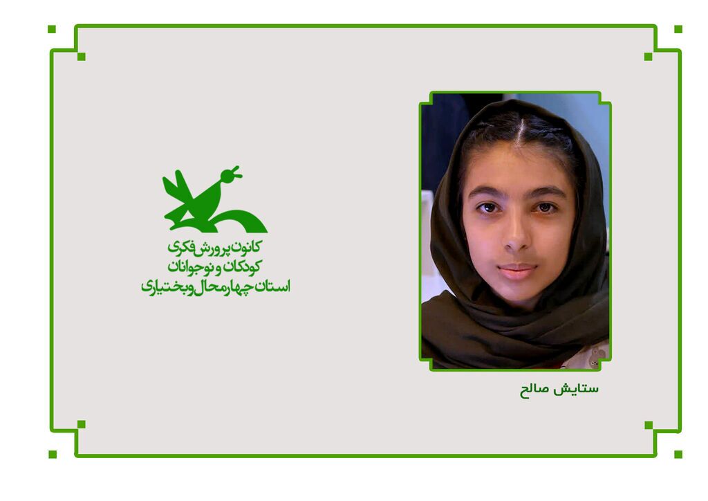 به گزارش خبرگزاری صداوسیما مرکز چهارمحال و بختیاری،ستایش صالح از اعضای فعال کارگاههای شعرسرایی مرکز فرخشهر، با ارائه اثری خلاقانه و کودکمحور توانست نظر گروه داوران جشنواره را جلب کند و در جمع برترینهای این دوره قرار گیرد.